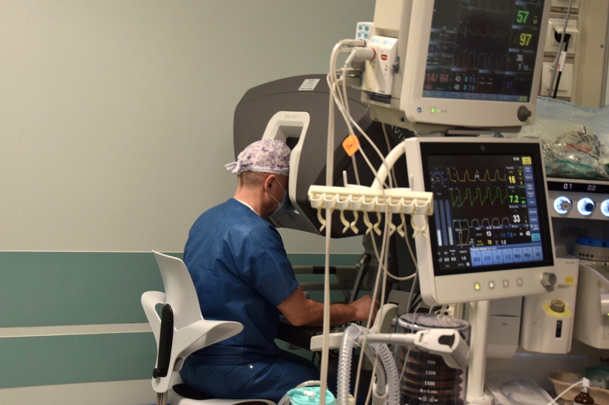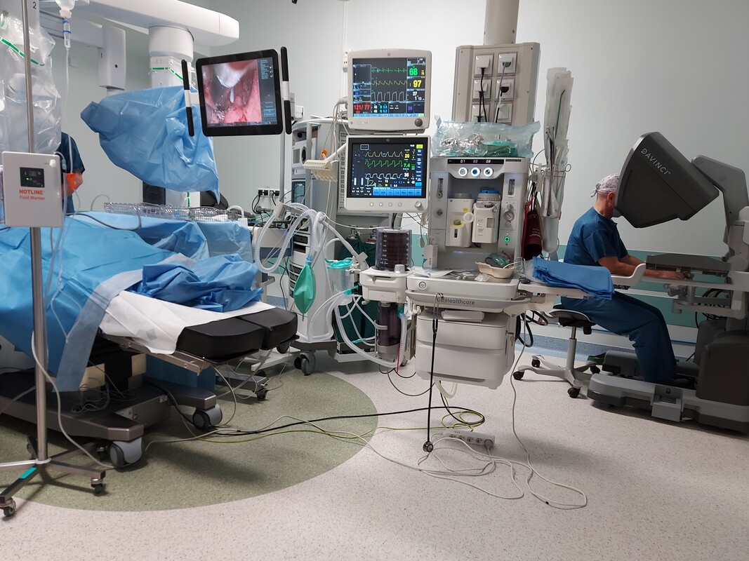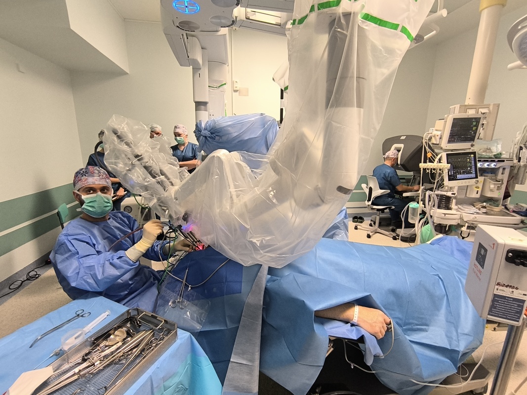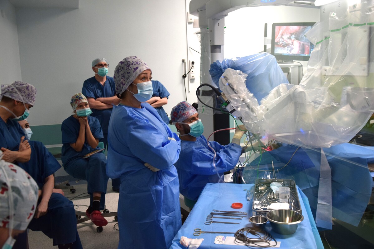 23 stycznia 2026 r. w szkoleniu na Bloku Operacyjnym ŚCO uczestniczyli lekarze i pielęgniarki z 5 Wojskowego Klinicznego Szpitala w Krakowie, którzy przygotowują się do wdrożenia robota da Vinci w chirurgicznym leczeniu nowotworów obszaru głowy i szyi. Obejrzeli trzy zabiegi operacyjne, w tym jeden wykonany u pacjenta z podejrzeniem wznowy nowotworu nasady języka, po wcześniejszej radiochemioterapii. - Dla tego chorego leczenie robotyczne jest ostatnią szansą na wyleczenie choroby – wyjaśnia dr n. med. Sławomir Okła, specjalista otorynolaryngologii, kierownik Kliniki Otolaryngologii, Chirurgii Głowy i Szyi ŚCO, pierwszy w Polsce proktor chirurgii robotycznej w zakresie nowotworów głowy i szyi.