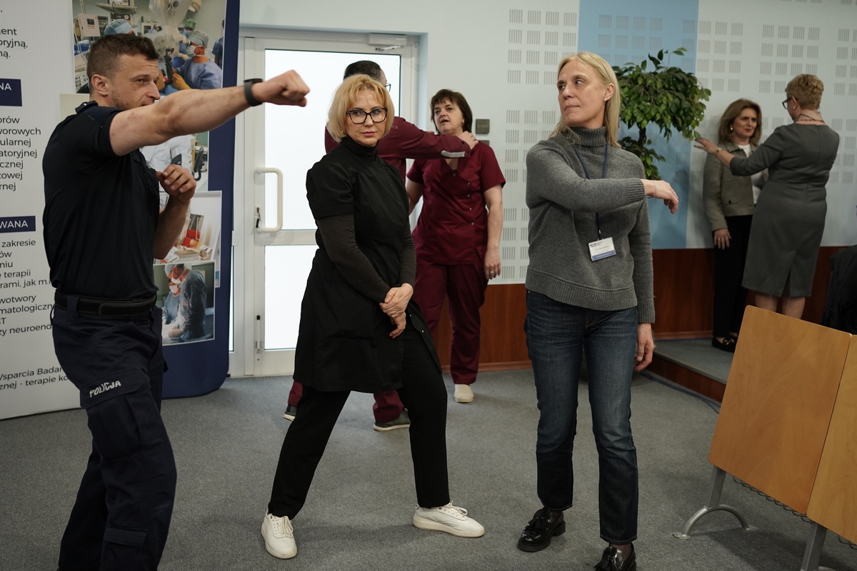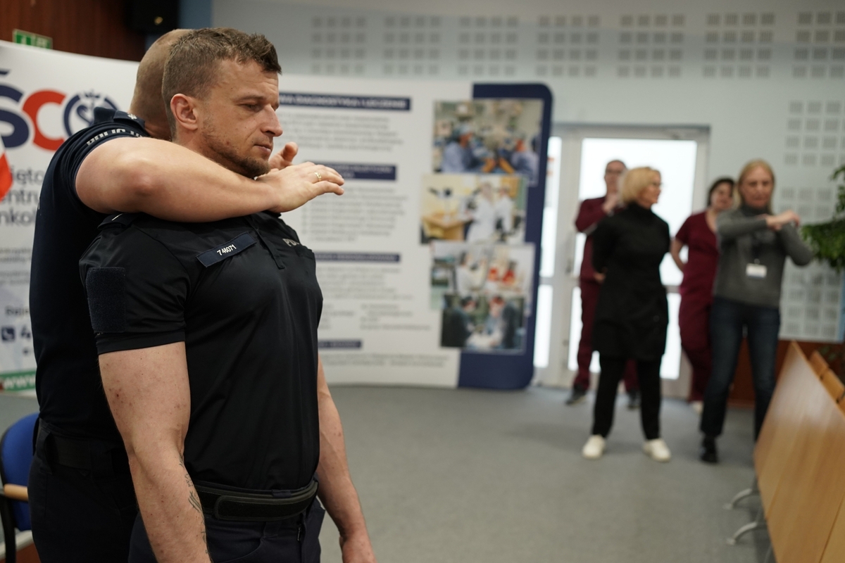 W dniach 23, 24 i 26 marca funkcjonariusze Komendy Wojewódzkiej Policji w Kielcach przeprowadzili wykłady oraz ćwiczenia praktyczne dla pracowników ŚCO. Podczas tych zajęć uczestnicy poznali techniki interwencji bezpieczne zarówno dla pacjentów, jak i personelu.
