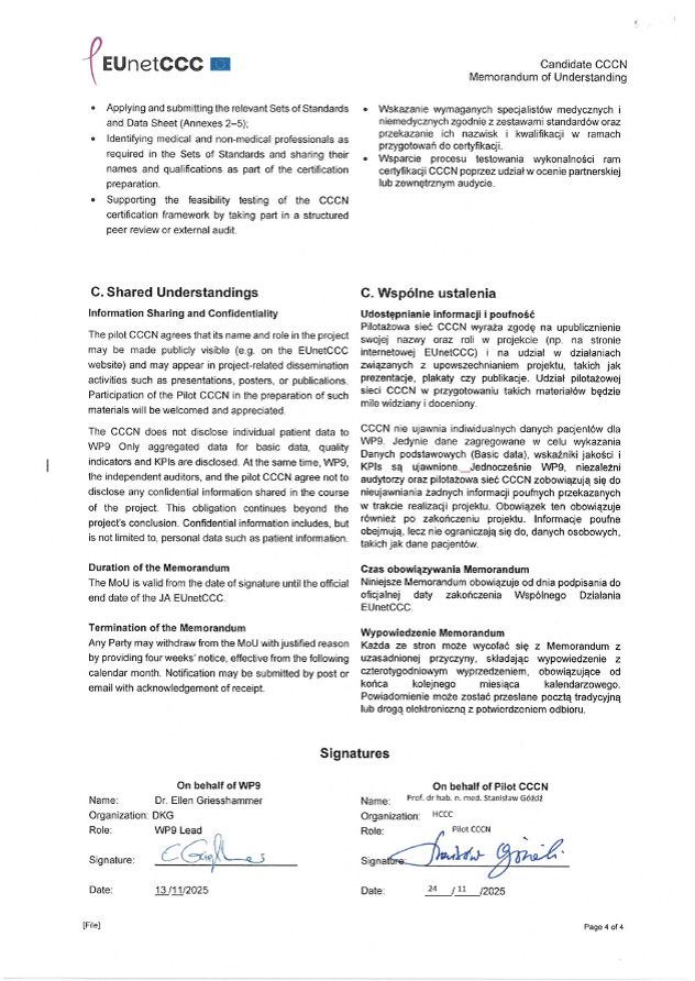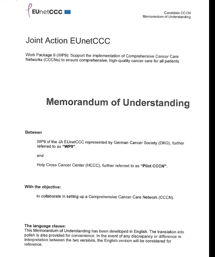 W tym celu w dniu 24 listopada 2025 roku Dyrektor Świętokrzyskiego Centrum Onkologii prof. dr hab. Stanisław Góźdź podpisał porozumienie (Memorandum of Understanding) z Niemieckim Towarzystwem Onkologicznym, które jest liderem europejskim w zakresie wsparcia i wdrażania CCCN w celu zapewnienia kompleksowej, wysokiej jakości opieki onkologicznej. Współliderem oraz jednostką nadzorującą działania krajowe w tym zakresie, jest Narodowy Instytut Zdrowia Publicznego i Higieny w Warszawie.