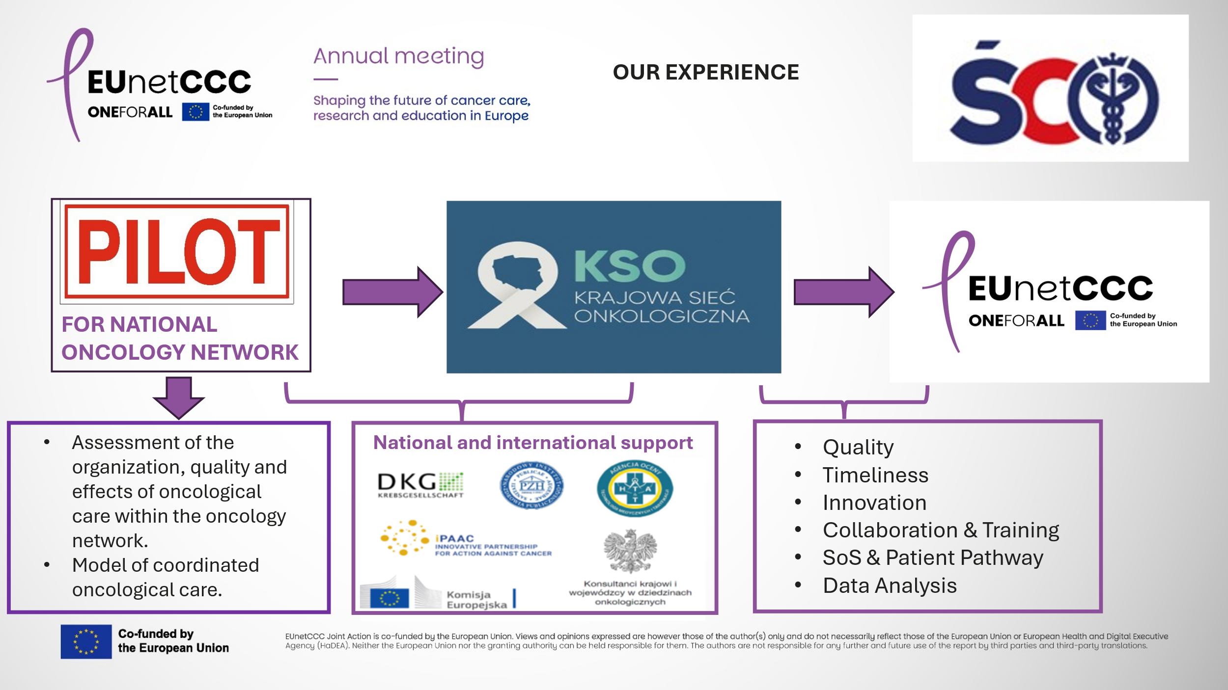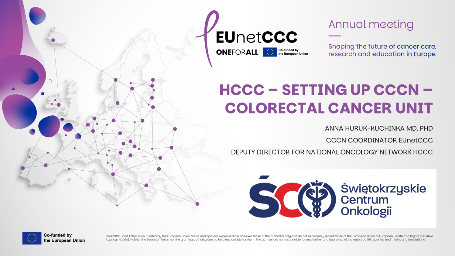 EUnetCCC to międzynarodowy projekt, realizujący Piąte Flagowe Zadanie Europejskiego Planu Walki z Rakiem (Europe’s Beating Cancer Plan, EBCP), które zakłada, że do 2030 roku 90% uprawnionych/kwalifikujących się pacjentów zostanie objętych opieką onkologiczną w Kompleksowych Centrach Onkologii, które będą spełniać ustalone kryteria jakości podlegające certyfikacji.